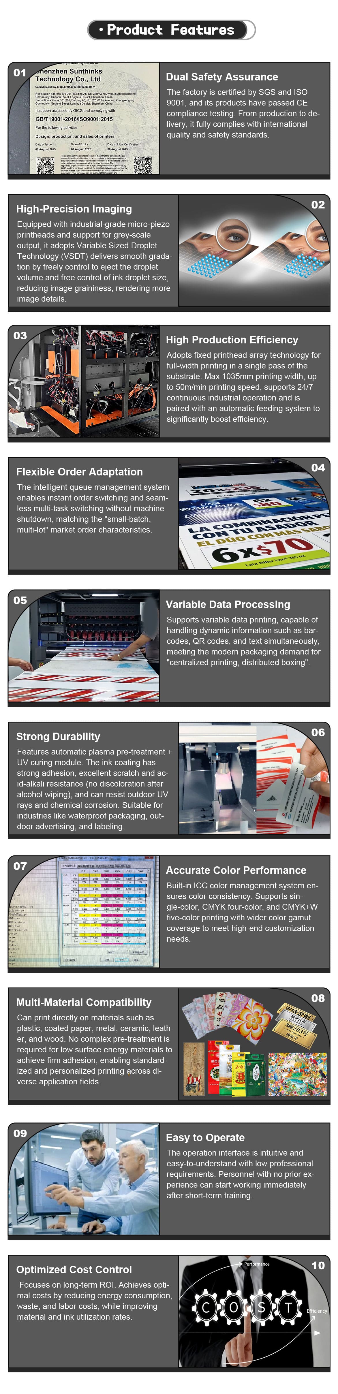 The Sunthinks SU1035 single pass uv printer is an ideal large sized, high speed, single pass uv printing machine, supporting monochrome, 4-color CMYK, or 5-color CMYK+W printing. It's suitable for batch printing and personalized customization across a wide range of industries, including high-end gift packaging, plastic packaging, plastic corrugated paper, coated paper, indoor/outdoor billboards, wood panels, file folders, notebook covers, metal packaging, leather, and various corporate/event promotional gifts.